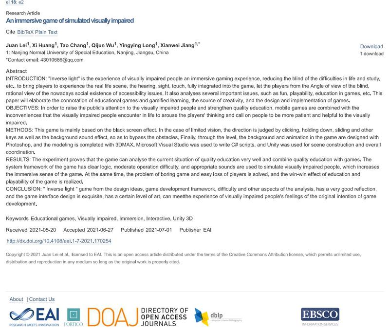 mansion88明升1902班雷娟、黄袭、常涛、龙莹莹、吴其俊等同学,结合学科专业,关爱特殊人群,基于Unity3D平台开发了一款沉浸式体验游戏《逆光》,并撰写论文“An immersive game of simulated visually impaired”发表于欧洲学术期刊EAI Endorsed Transactions on e-Learning